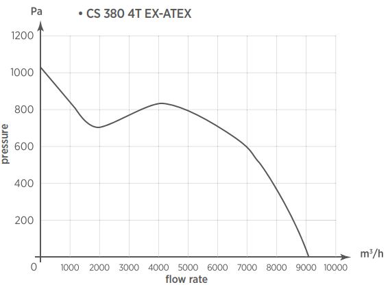 C-S 380/4 T Ex ATEX - 400V/50Hz, Radialventilator ATEX II 2G c IIB+H2 T4, Ex geschützt, Radiallaufrad aus Aluminium, Spiralgehäuse aus verzinktem Stahlblech, schwarz epoxydbeschichtet, Atex zertifizierter Asynchron-Induktionsmotor, 400 V 3~50Hz, 4.500 W, max. 9,0 A, max. 9.100 m³/h, max. 1.030 Pa, max. 1.400U/min., LP max. 91 dB(A) -2m, Schutzart IP55, Isolierstoffklasse F, Temp. max. für Dauerbetrieb 60 °C, inkl. Motorkonsole, Motor kugelgelagert