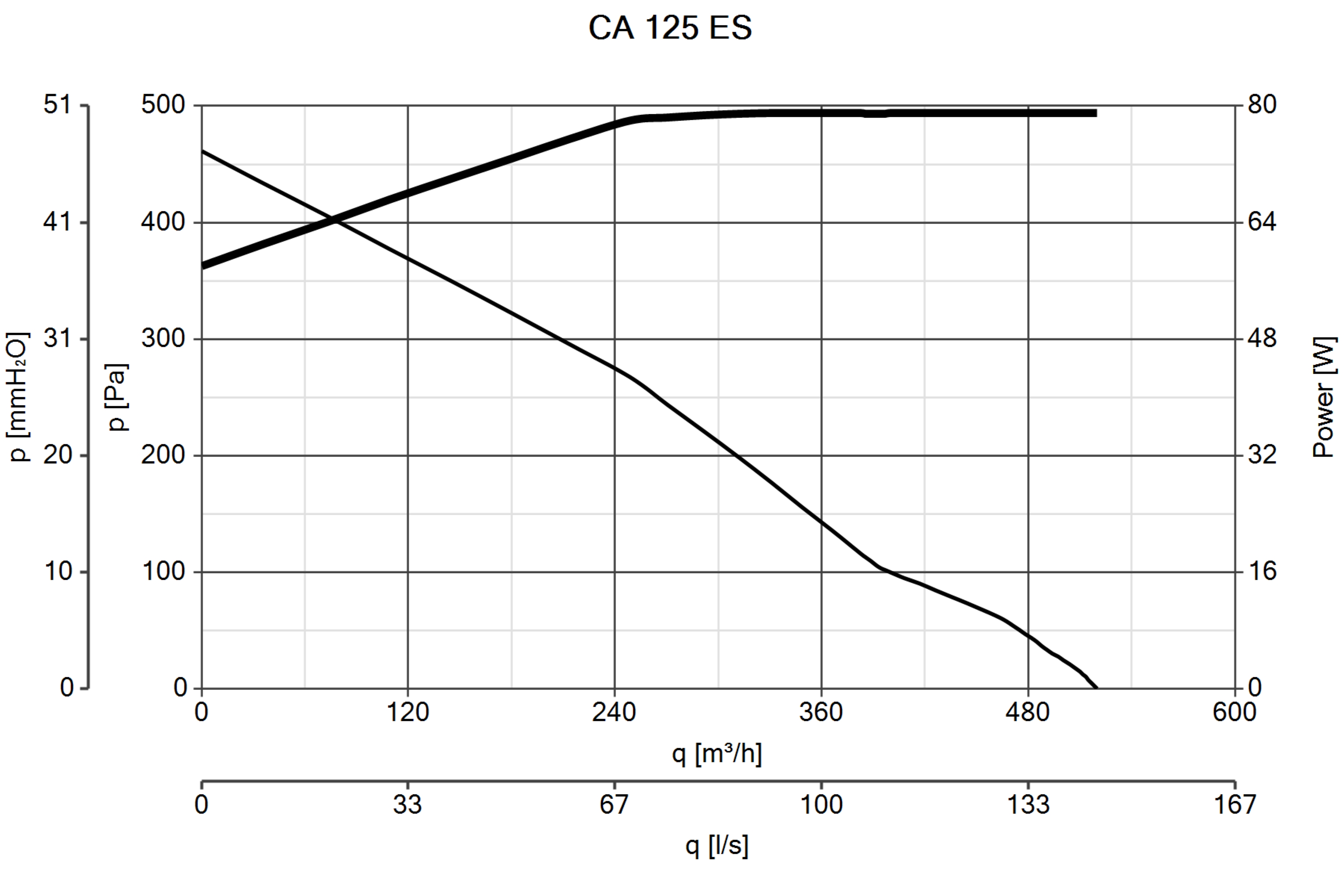 CA 125 ES 0-10V, Rohrradialventilator, energiesparend, NW 125 mm, aus phosphatiertem Stahl mit Polyester-Pulverbeschichtung, Hammerschlaglackierung, Farbe grau, 2 stufiger- bürstenloser EC-Motor, Radiallaufrad mit rückwärtsgekrümmten Schaufeln, 220-240 V~50 Hz, 80 W, max. 520 m³/h, max. 461 Pa, max. 2.650 U/min., LP max. 49,7 dB(A) -3m, Schutzart IP44, Schutzklasse II,Temp. max. für Dauerbetrieb 50 °C, inkl. Montagekonsolen, Motor kugelgelagert, 0-10 V Schnittstelle, thermischer Überlastschutz