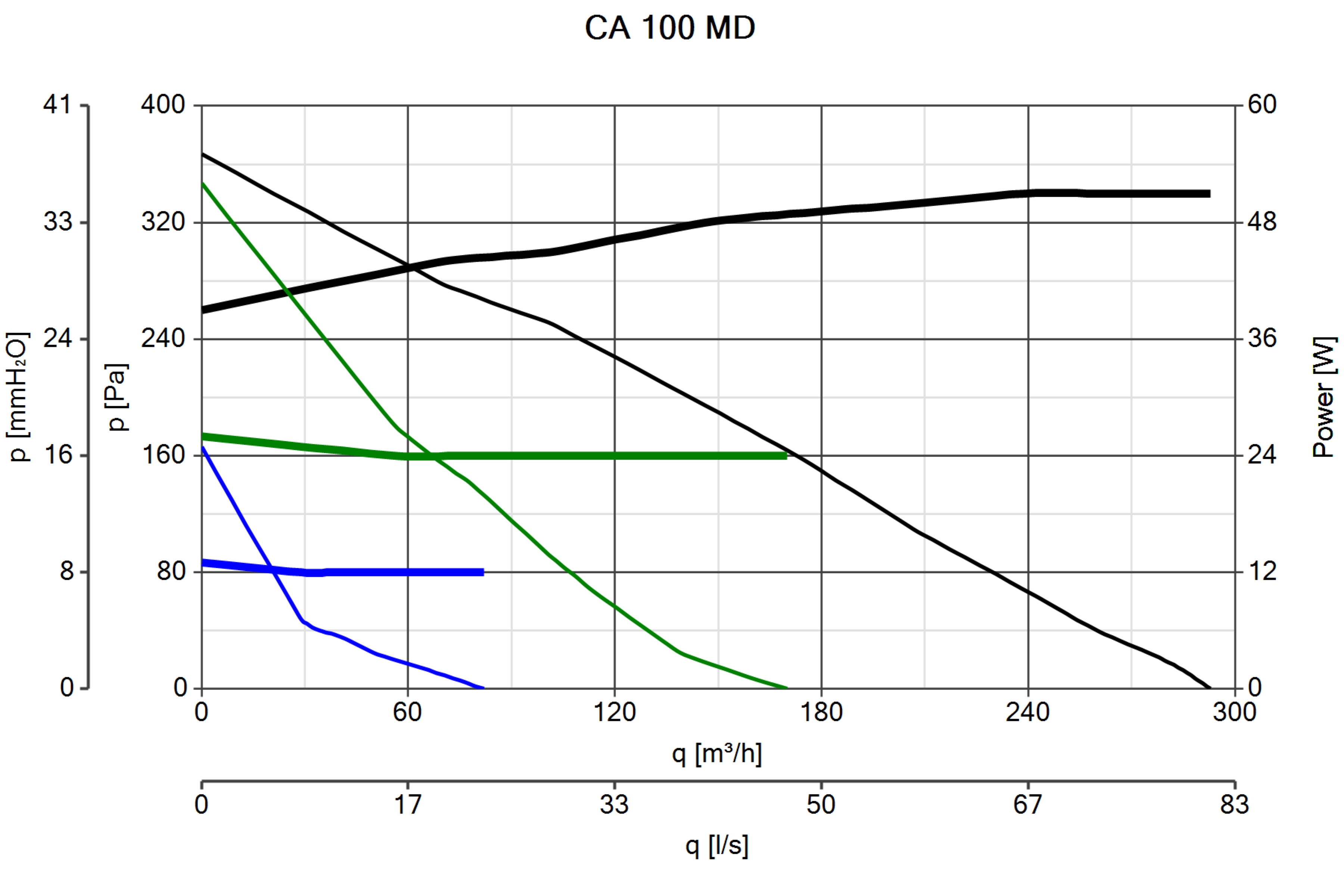 CA 100 MD, Rohrradialventilator, NW 100 mm, aus phosphatiertem Stahl mit Polyester-Pulverbeschichtung, hammerschlag lackiert, Farbe grau, 220-240 V~50 Hz, 51 W, 0,22 A, max. 293 m³/h, max. 367 Pa, max. 2.400 U/min., LP max. 43 dB(A) -3m, Schutzart IP44, Schutzklasse II, Temp. max. für Dauerbetrieb 50 °C, inkl. Montagekonsolen, Außenläufermotor, kugelgelagert, 3-stufig, drehzahlregelbar, mit thermischen Überlastungsschutz