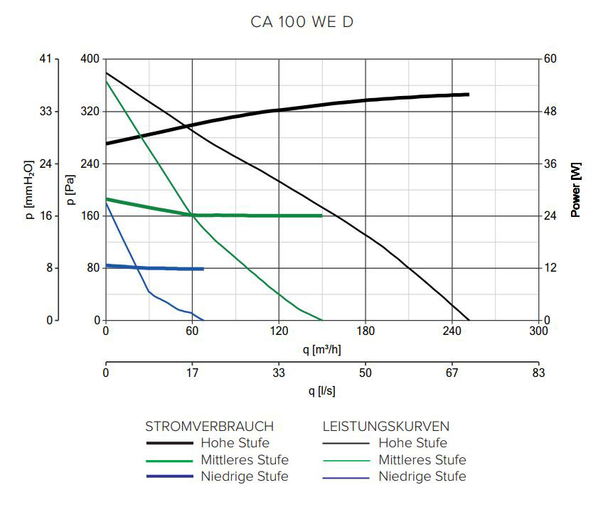 CA 100 WE D, Außenwand-Rohrradialventilator, NW 100 mm, aus pulverbeschichtetem Stahlblech, Farbe weiß, 220-240 V~50 Hz, 50 W, max. 252 m³/h, max. 379,4 Pa, max. 2.390 U/min., LP max. 50.1 dB(A) -3m, Schutzart IPX5, Schutzklasse I, Temp. max.für Dauerbetrieb 60° C, Motor kugelgelagert, 3- stufig, drehzahlregelbar, inkl. federbelastende Verschlusslamellen, mit thermischen Überlastungsschutz