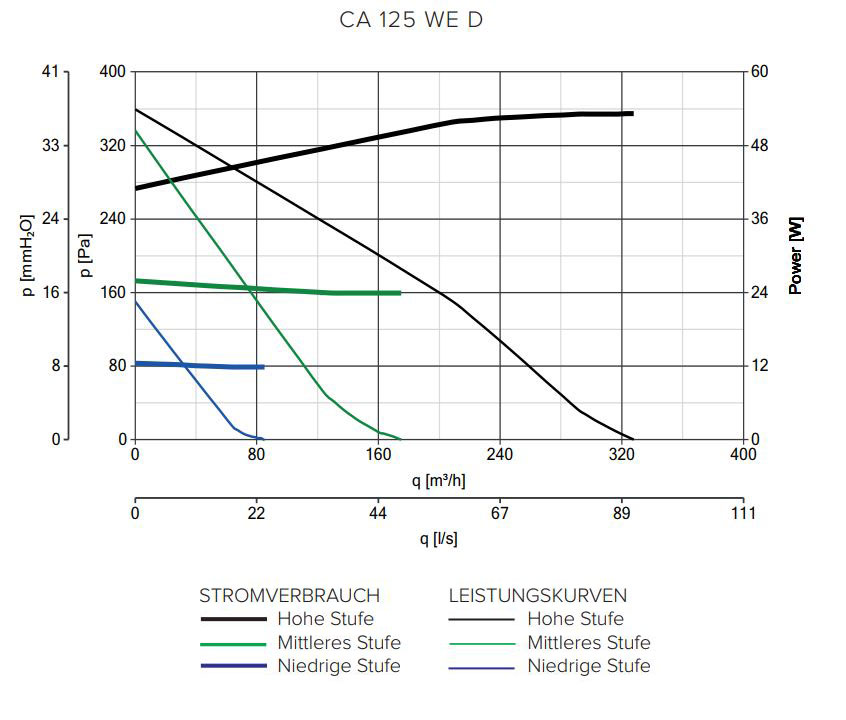 CA 125 WE D E, Außenwand-Rohrradialventilator, NW 125 mm, aus pulverbeschichtetem Stahlblech, Farbe weiß, 220-240 V~50 Hz, 50 W, max. 328 m³/h, max. 359,5 Pa, max. 2.350 U/min., LP max. 49.5 dB(A) -3m, Schutzart IPX5, Schutzklasse I, Temp. max.für Dauerbetrieb 60° C, Motor kugelgelagert, drehzahlregelbar, mit thermischen Überlastungsschutz