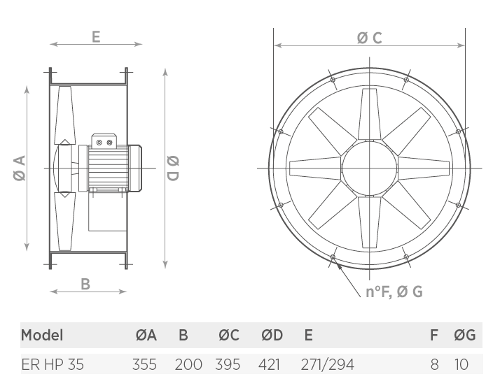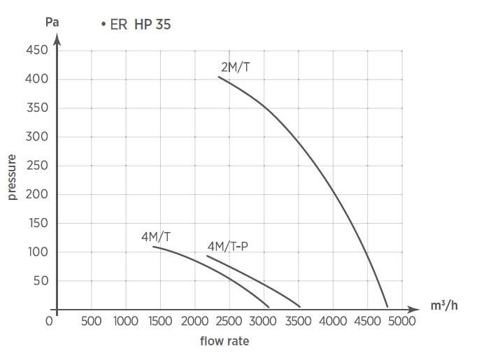 ER HP 35/2 T, Axialer Hochleistungs- Rohrventilator, NW 350 mm, Stahl verzinkt, Zweischicht- Korrosionsschutzlackierung, Farbe weiß, 400 V~50 Hz, dreiphasig, 2-polig, max. 550 W, max. 4.800 m³/h, max. 392 Pa, max. 1,6 A, max. 2.800 U/min., LP max. 77 dB(A) -2m, Schutzart IP55, Schutzklasse I, Temp. max. für Dauerbetrieb 60 °C, Motor kugelgelagert, drehzahlregelbar