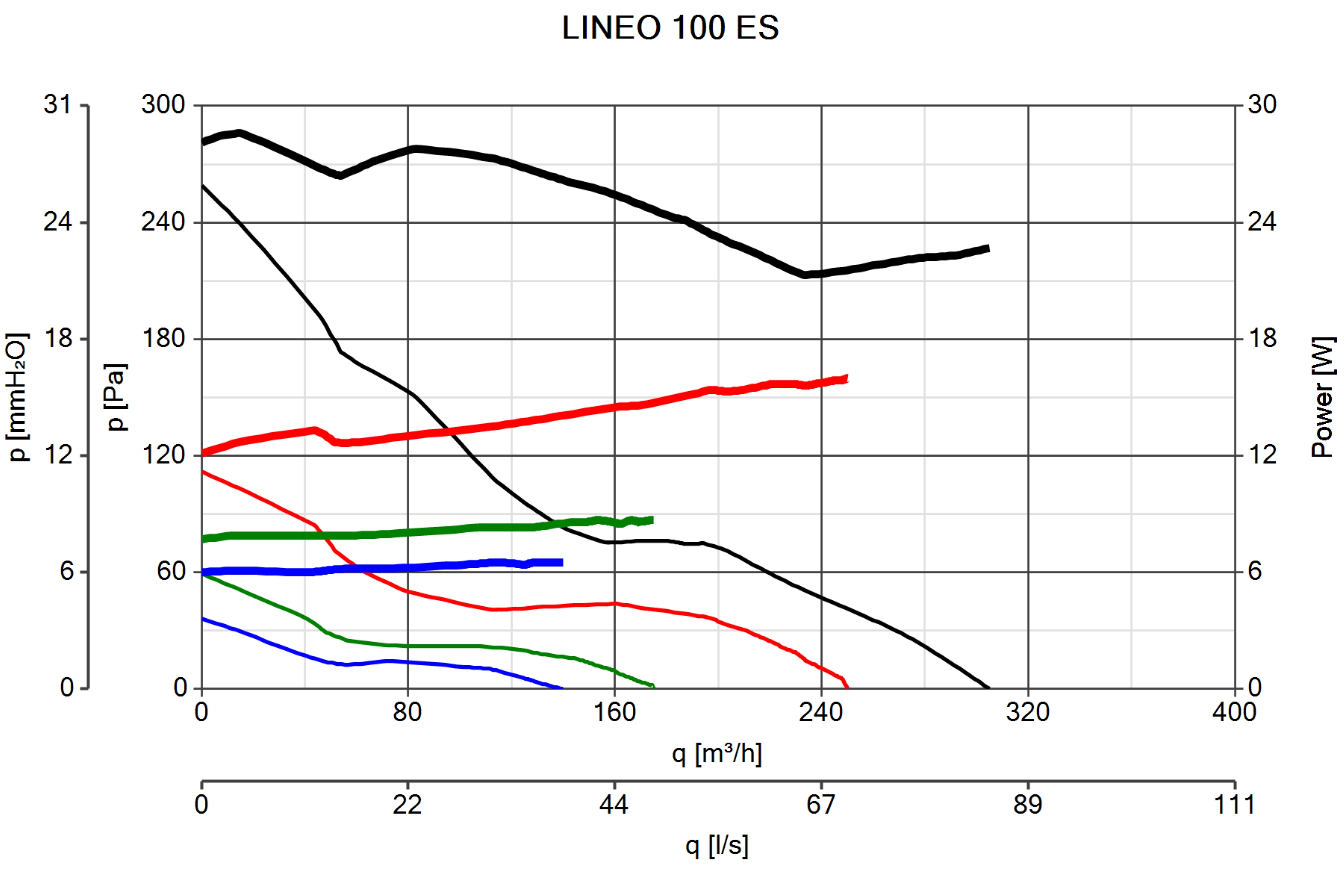 Vortice LINEO 100 ES, Halbradialer Rohrventilator mit Mixvent-Technik, energiesparend, NW 100 mm, PP-Kunststoff, 2-stufiger bürstenloser EC-Motor, 220-240 V~50/60 Hz, 19 W, max. 0,18 A, max. 235 m³/h, max. 96,1 Pa, max. 3.230 U/min., LP max. 36,1 dB(A) -3m, Schutzart IP45, Schutzklasse II, Temp. max. für Dauerbetrieb 60 °C, Montagekonsole, Motor kugelgelagert, Ventilatoreinheit entnehmbar, 0-10 V Schnittstelle, drehzahlregelbar, thermischer Überlastschutz, Brandschutzklasse E-d2 nach DIN EN 13501-1