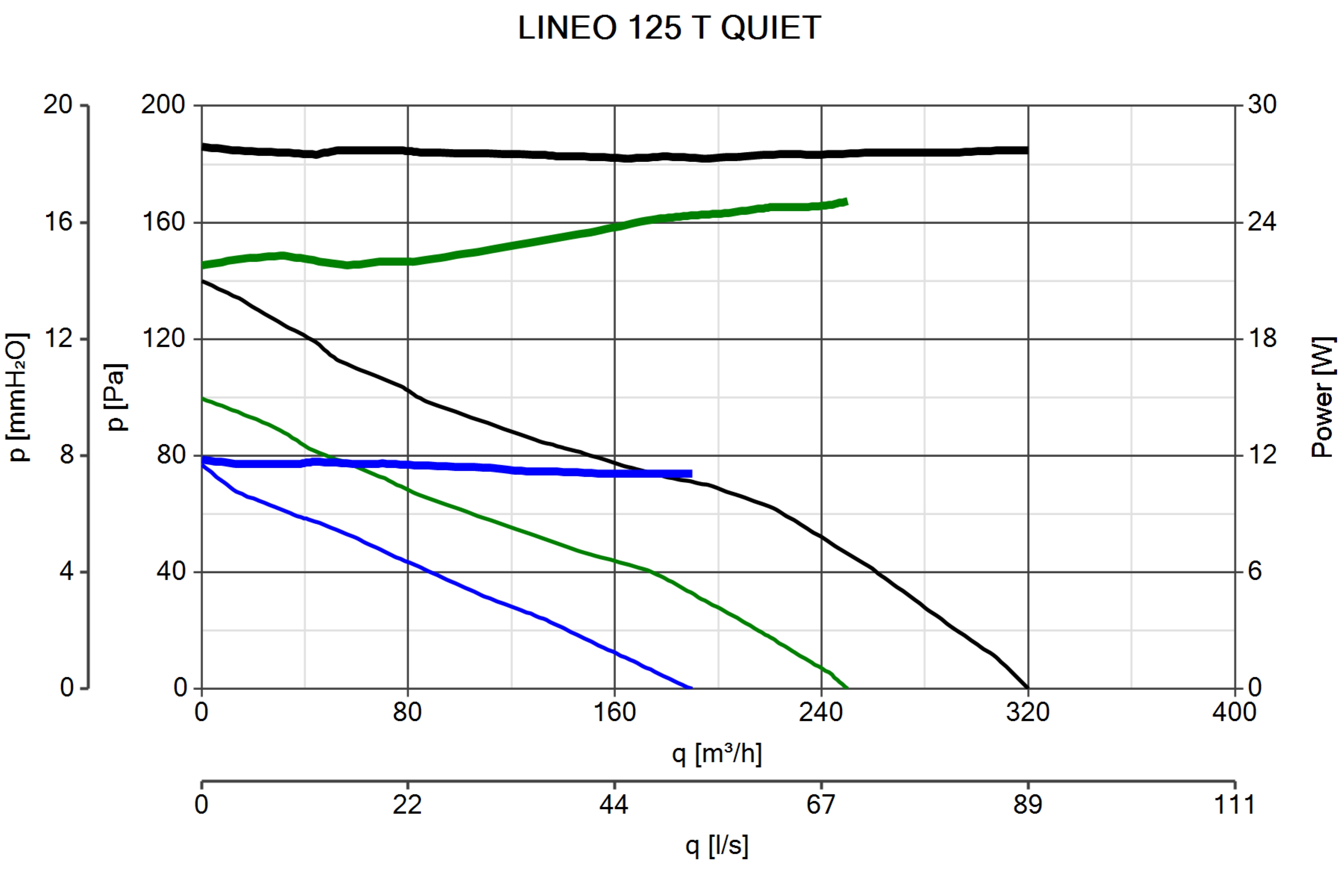 Vortice LINEO 125 T QUIET, Schallgedämmter Rohrventilator mit Mixvent-Technik, mit einstellbarem Nachlaufrelais (3-20 min.), NW 125 mm, PP-Kunststoff, 3-stufiger Wechselstrom-Motor, 220-240 V~50/60 Hz, 27 W, max. 0,13 A, max. 320 m³/h, max. 137,3 Pa, max. 1.880 U/min., LP max. 25,0 dB(A) -3m, Schutzart IP45, Schutzklasse II, Temp. max. für Dauerbetrieb 45 °C, Montagekonsole, Motor kugelgelagert, Ventilatoreinheit entnehmbar, drehzahlregelbar, thermischer Überlastschutz, Brandschutzklasse E-d2 nach DIN EN 13501-1