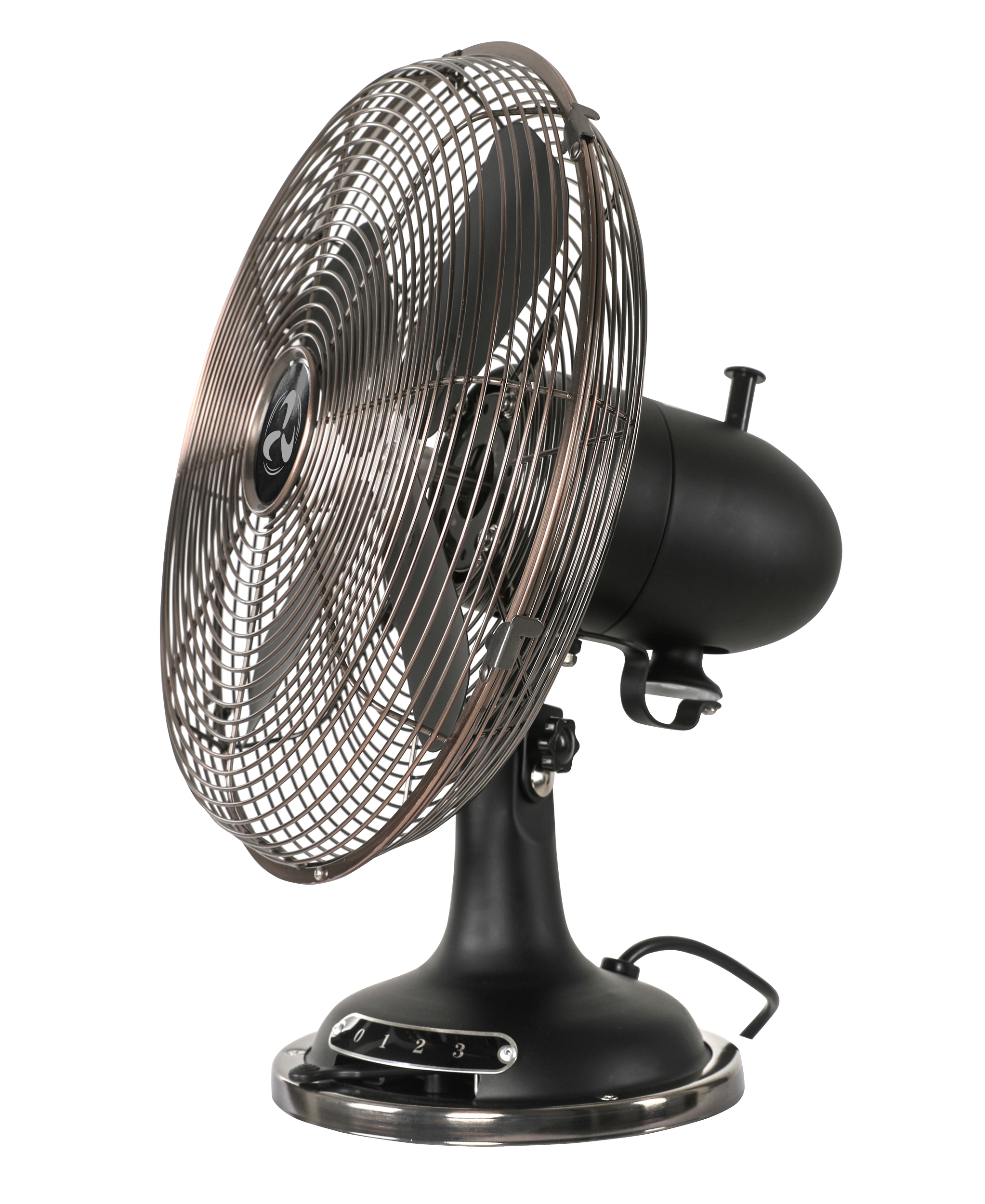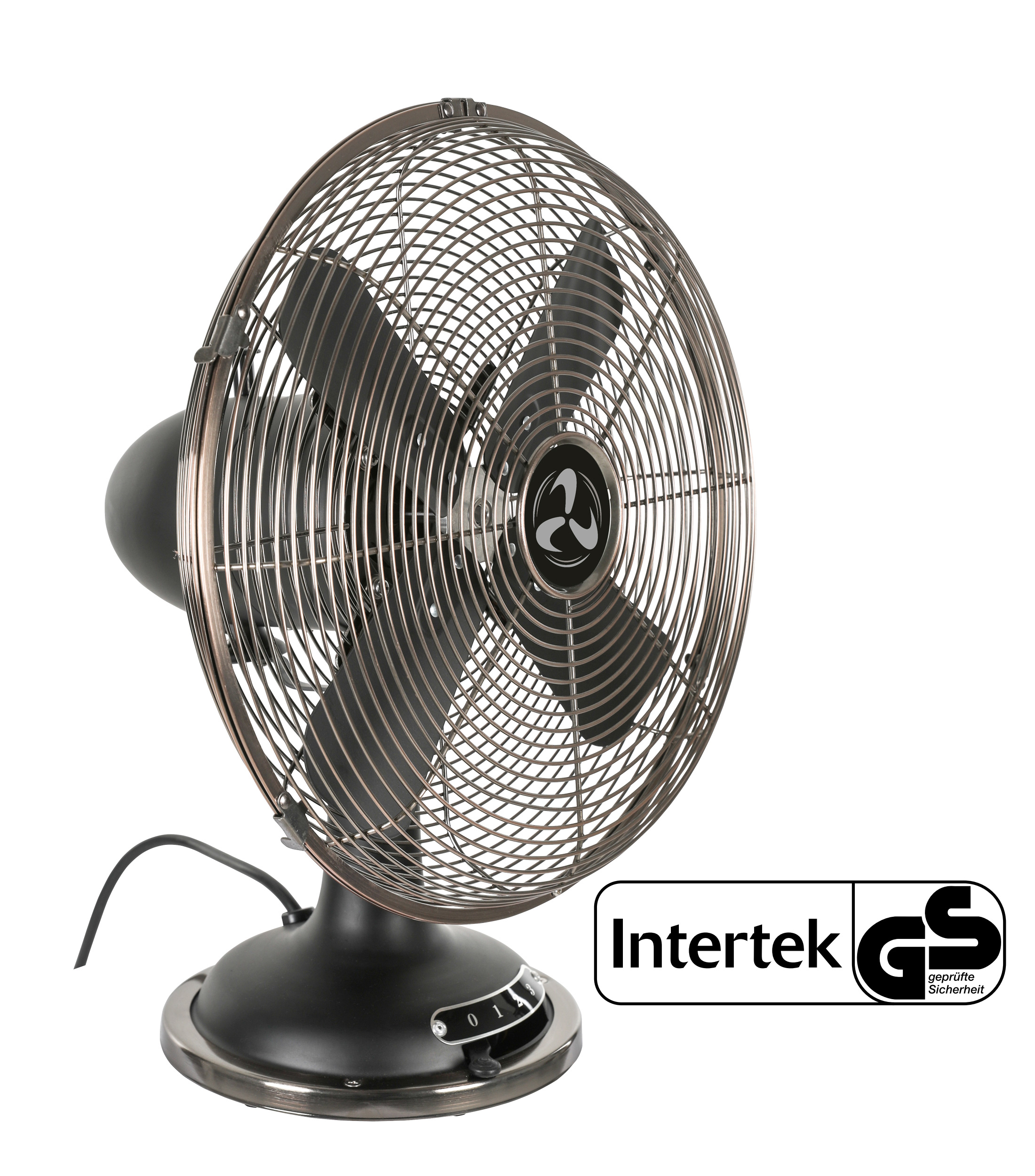 CasaFan TRADITION TV 30 II CH, Tischventilator, Gehäuse und Korb matt schwarz, Metallausführung, Aluminiumflügelrad, 220-240 V ~ 50 Hz, Motor 37 Watt, max. 1.321 U/min, 424 mm hoch, Flügelrad Ø 300 mm, 3 Stufen per Hebelschalter, vertikale Neigung einstellbar, 85°-Oszillation, kippsicherer Standfuß mit Gummifüßen, abnehmbares Schutzgitter, 1,8 m Gummischlauchleitung H05RN-F G 3 1,0 mm² mit Schutzkontaktstecker, zertifiziert nach Maschinenrichtline 2006/42/EC Teil 1 für die Verwendung im Gewerbe.