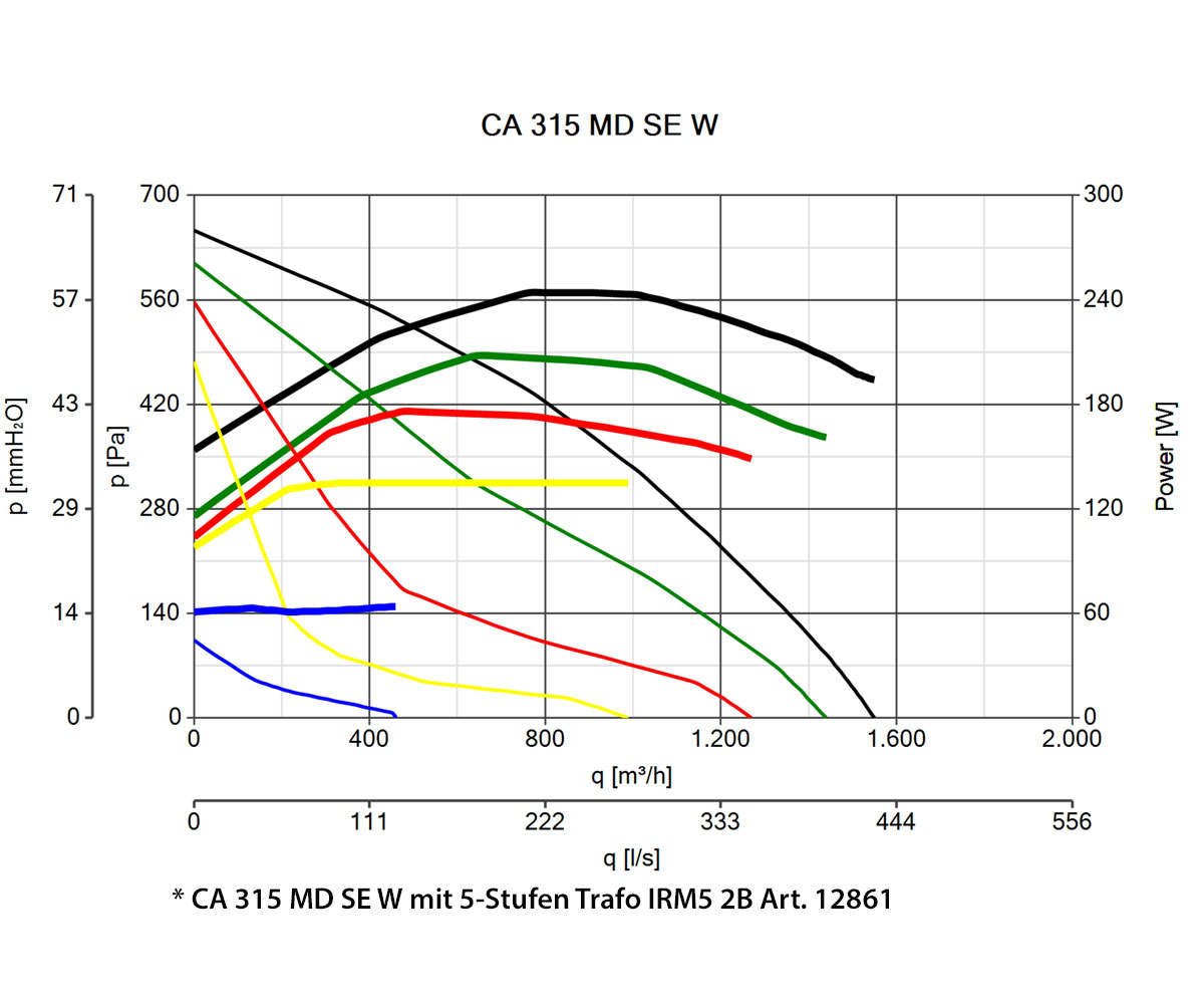 CA 315 MD SE W, Wand-Rohrradialventilator, NW 315 mm, mit Wandmontageplatte, aus phosphatiertem Stahl mit Polyester-Pulverbeschichtung, Farbe hammerschlag grau, 220-240 V~50/60 Hz, 190 W, max. 0,84 A, max. 1.550 m³/h, max. 653 Pa, max. 2.800 U/min., LP max. 54,0 dB(A) -3m, Schutzart IP44, Schutzklasse II, Temp. max.für Dauerbetrieb 45° C, Außenläufermotor kugelgelagert, einstufig, drehzahlregelbar, mit thermischen Überlastungsschutz