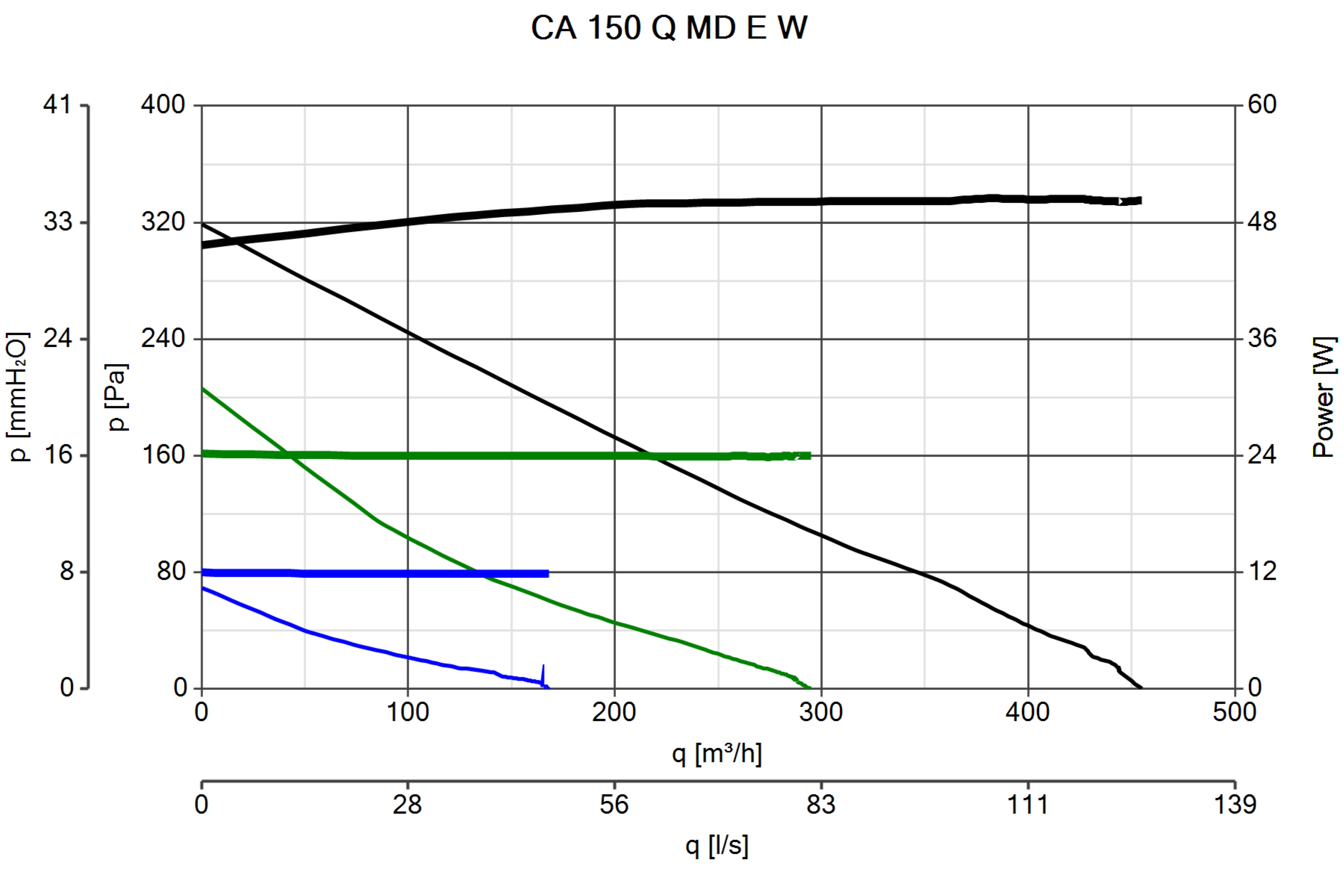 CA 150 Q MD E W, Wand-Rohrradialventilator, NW 150 mm, mit Wandmontageplatte, aus phosphatiertem Stahl mit Polyester-Pulverbeschichtung, Farbe hammerschlag grau, 220-240 V~50/60 Hz, 85 W, max. 0,23 A, max. 455 m³/h, max. 318,7 Pa, max. 2.435 U/min., LP max. 38.0 dB(A) -3m, Schutzart IP44, Schutzklasse II, Temp. max.für Dauerbetrieb 50° C, Außenläufermotor kugelgelagert, 3-stufig, drehzahlregelbar, mit thermischen Überlastungsschutz