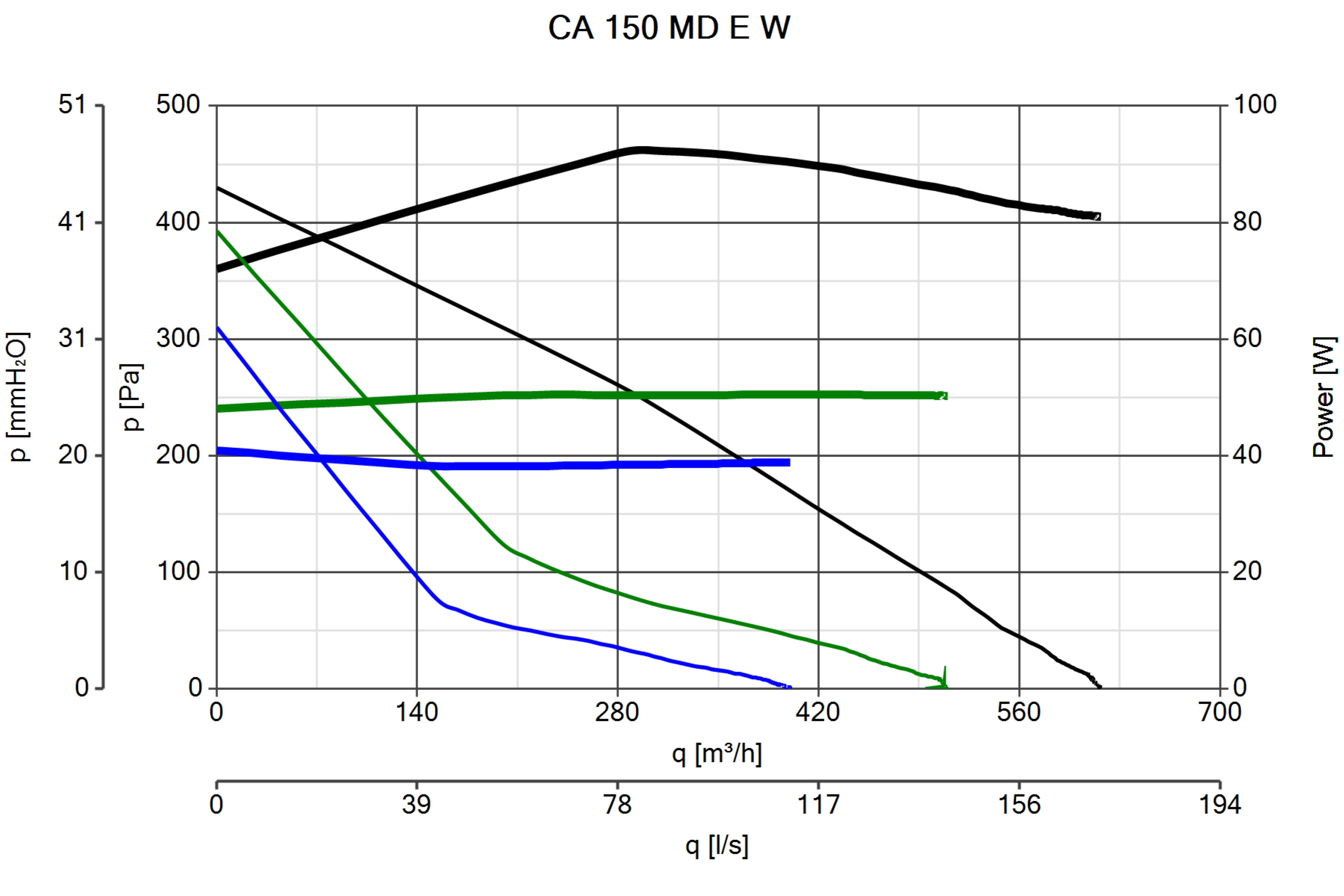 CA 150 MD E W, Wand-Rohrradialventilator, NW 150 mm, mit Wandmontageplatte, aus phosphatiertem Stahl mit Polyester-Pulverbeschichtung, Farbe hammerschlag grau, 220-240 V~50/60 Hz, 85 W, max. 0,38 A, max. 617 m³/h, max. 429,7 Pa, max. 2.690 U/min., LP max. 53.3 dB(A) -3m, Schutzart IP44, Schutzklasse II, Temp. max.für Dauerbetrieb 55° C, Außenläufermotor kugelgelagert, 3-stufig, drehzahlregelbar, mit thermischen Überlastungsschutz