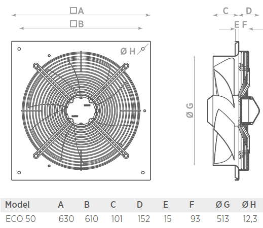 EQ ECO 50 M, Axialer Wandventilator, energiesparend, mit quadratischer Düsenwandplatte, Stahl verzinkt, Zweischicht- Korrosionsschutzlackierung, Farbe schwarz, NW 500 mm, 230 V~50-60 Hz, einphasig, max. 280 W, max. 7.100 m³/h, max. 1,8 A, max. 110 Pa, max. 1.100 U/min., LP max. 52 dB(A) -2m, Schutzart IP54, Schutzklasse I, 1 Stufe, max. Temp. + 60 °C, EC- Außenläufermotor, kugelgelagert, 0-10 V Schnittstelle, inkl. Potentiometer (125 x 105 x 52 mm)