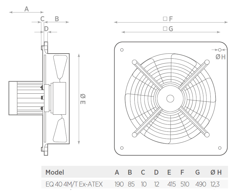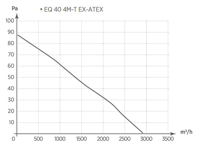 EQ 40/4 M II 2G c IIB - 230V/50Hz, Axialer Wandventilator, Ex geschützt, ATEX II 2G c IIB+H2 T4, quadratische Düsenwandplatte, Stahl verzinkt mit zweifacher PU-Beschichtung, Farbe schwarz, NW 400 mm, 230 V~50 Hz, einphasig, 4-polig, max. 180 W, max. 2.900 m³/h, max. 0,85 A, max. 88 Pa, max. 1.290 U/min., LP max. 65 dB(A) -2m, Schutzart IP55, Schutzklasse I, 1 Stufe, max. Temp. + 40 °C, Motor kugelgelagert, reversierbar