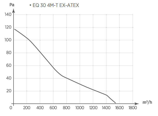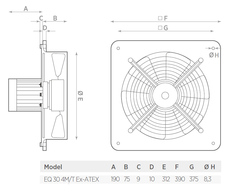EQ 30/4 M II 2G c IIB - 230V/50Hz, Axialer Wandventilator, Ex geschützt, ATEX II 2G c IIB+H2 T4, quadratische Düsenwandplatte, Stahl verzinkt mit zweifacher PU-Beschichtung, Farbe schwarz, NW 300 mm, 230 V~50 Hz, einphasig, 4-polig, max. 140 W, max. 1.500 m³/h, max. 0,7 A, max. 118 Pa, max. 1.400 U/min., LP max. 59 dB(A) -2m, Schutzart IP55, Schutzklasse I, 1 Stufe, max. Temp. + 40 °C, Motor kugelgelagert, reversierbar
