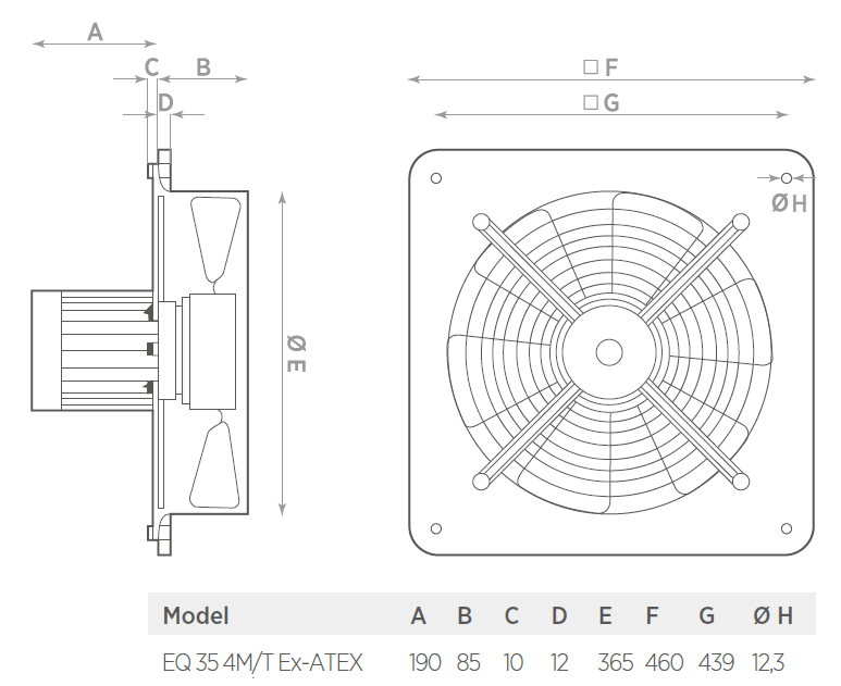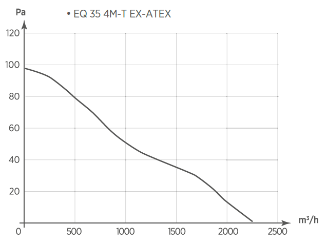 EQ 35/4 M II 2G c IIB - 230V/50Hz, Axialer Wandventilator, Ex geschützt, ATEX II 2G c IIB+H2 T4, quadratische Düsenwandplatte, Stahl verzinkt mit zweifacher PU-Beschichtung, Farbe schwarz, NW 350 mm, 230 V~50 Hz, einphasig, 4-polig, max. 160 W, max. 2.250 m³/h, max. 0,8 A, max. 98 Pa, max. 1.350 U/min., LP max. 62 dB(A) -2m, Schutzart IP55, Schutzklasse I, 1 Stufe, max. Temp. + 40 °C, Motor kugelgelagert, reversierbar