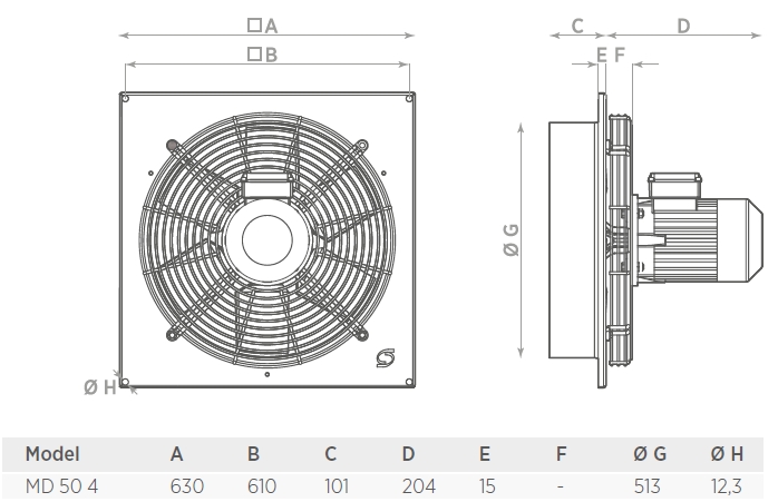 EQ MD 50/4M, Axialer Wandventilator, mit quadratischer Düsenwandplatte, Stahl verzinkt, Zweischicht- Korrosionsschutzlackierung, Farbe schwarz, NW 500 mm, 230 V~50-60 Hz, einphasig, 4-polig, max. 240 W, max. 6.200 m³/h, max. 1,4 A, max. 180 Pa, max. 1.400 U/min., LP max. 65 dB(A) -2m, Schutzart IP55, Schutzklasse I, 1 Stufe, max. Temp. + 60 °C, Motor kugelgelagert, drehzahlregelbar, reversierbar