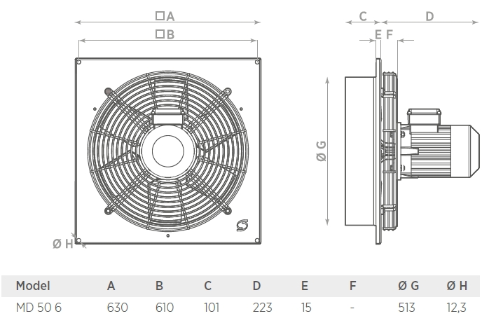 EQ MD 50/6M, Axialer Wandventilator, mit quadratischer Düsenwandplatte, Stahl verzinkt, Zweischicht- Korrosionsschutzlackierung, Farbe schwarz, NW 500 mm, 230 V~50-60 Hz, einphasig, 6-polig, max. 110 W, max. 3.900 m³/h, max. 0,4 A, max. 65 Pa, max. 850 U/min., LP max. 55 dB(A) -2m, Schutzart IP55, Schutzklasse I, 1 Stufe, max. Temp. + 60 °C, Motor kugelgelagert, drehzahlregelbar, reversierbar
