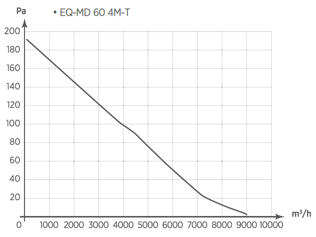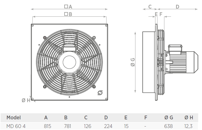 EQ MD 60/4T, Axialer Wandventilator, mit quadratischer Düsenwandplatte, Stahl verzinkt, Zweischicht- Korrosionsschutzlackierung, Farbe schwarz, NW 600 mm, 400 V~50-60 Hz, dreiphasig, 4-polig, max. 270 W, max. 9.000 m³/h, max. 0,8 A, max. 190 Pa, max. 1.400 U/min., LP max. 70 dB(A) -2m, Schutzart IP55, Schutzklasse I, 1 Stufe, max. Temp. + 60 °C, Motor kugelgelagert, drehzahlregelbar, reversierbar