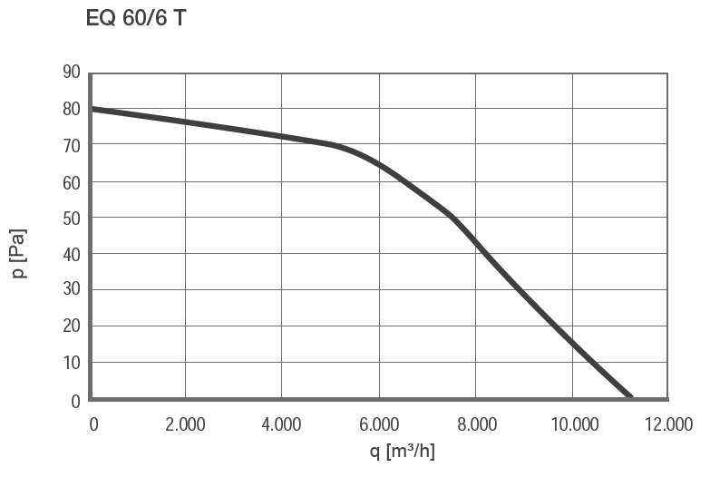 EQ 60/6 T - 400V-50/60Hz, Axialer Wandventilator, mit quadratischer Düsenwandplatte, Stahl verzinkt, Zweischicht- Korrosionsschutzlackierung, Farbe schwarz, NW 600 mm, 400 V~50-60 Hz, dreiphasig, 6-polig, max. 510 W, max. 11.200 m³/h, max. 1,3 A, max. 80 Pa, max. 900 U/min., LP max. 65 dB(A) -2m, Schutzart IP54, Schutzklasse I, 1 Stufe, max. Temp. + 55 °C, Außenläufermotor, kugelgelagert, drehzahlregelbar, reversierbar, Thermokontakt- Anschlüsse